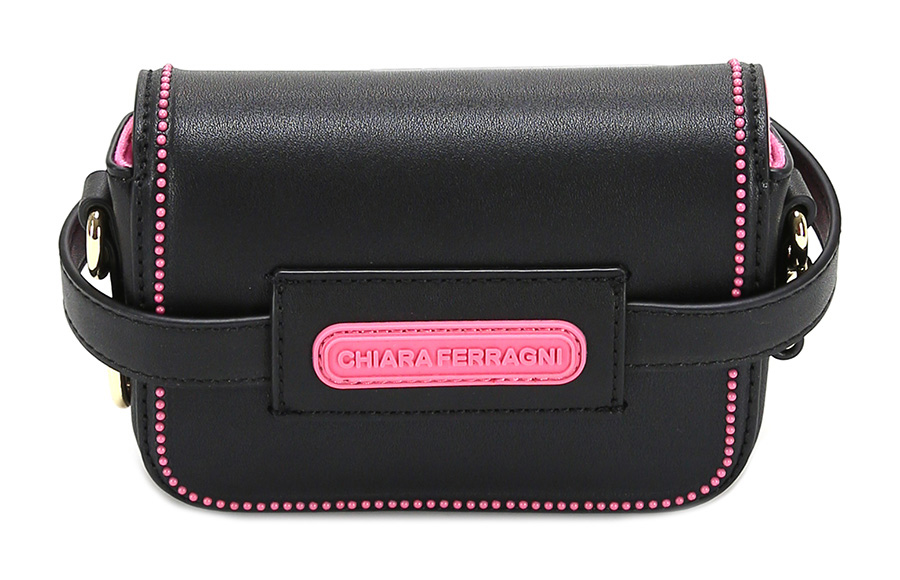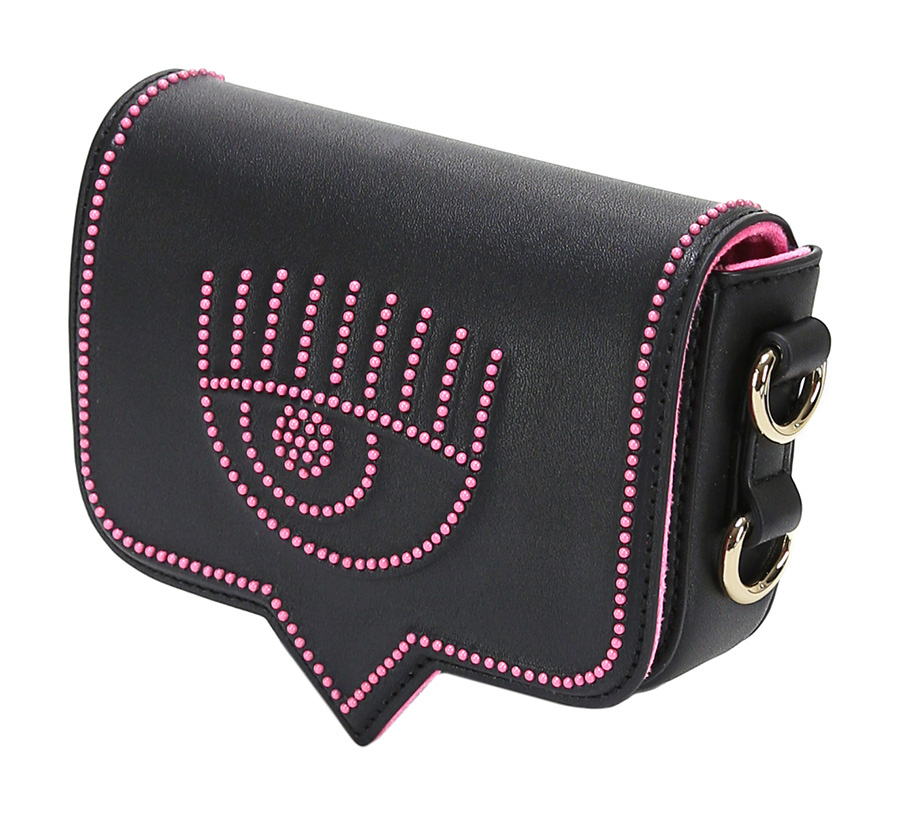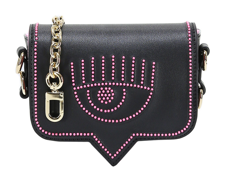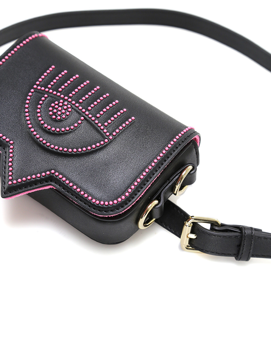 Borsa in pelle sintetica con bottone magnetico di chiusura. Cintura inclusa. Tracolla in metallo inclusa. Misure 15 x 13 cm.