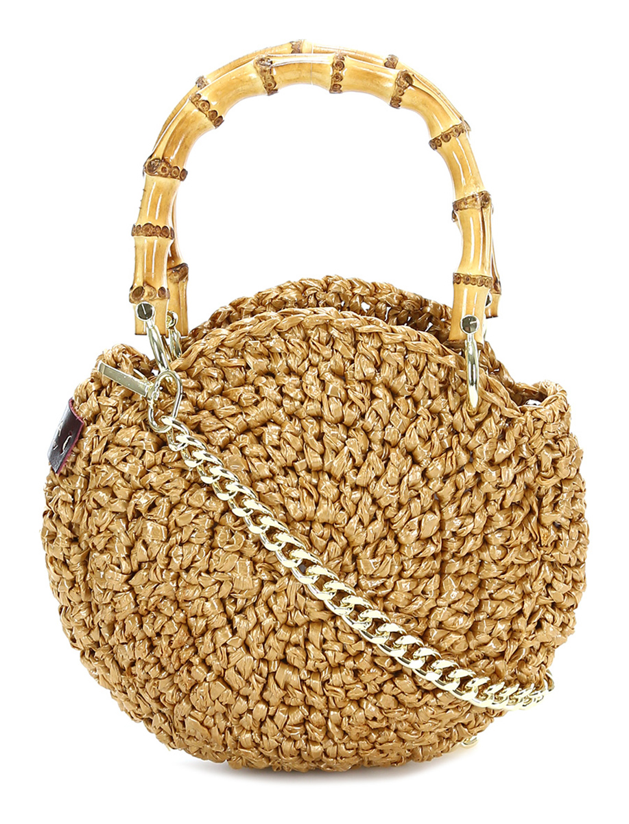 Borsa in rafia intrecciata a mano. Manico rigido. Pochette interna estraibile. Tracolla inclusa. Misure 25 x 23 cm. Dettagli gold.