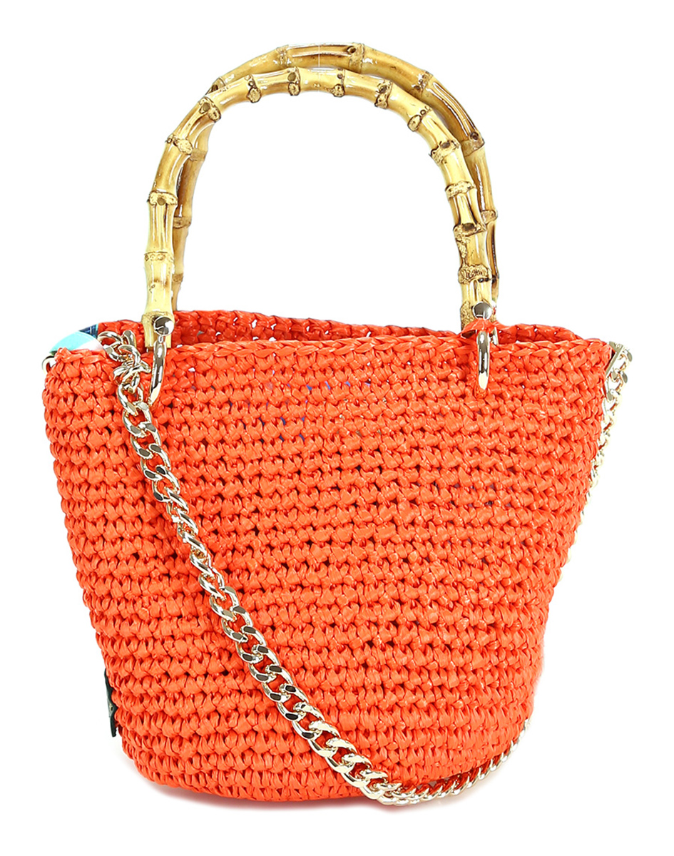 Borsa in rafia intrecciata. Tracolla in metallo inclusa. Pochette in cotone estraibile. Manici in bamboo. Misure 26 x 20 cm. Dettagli gold.