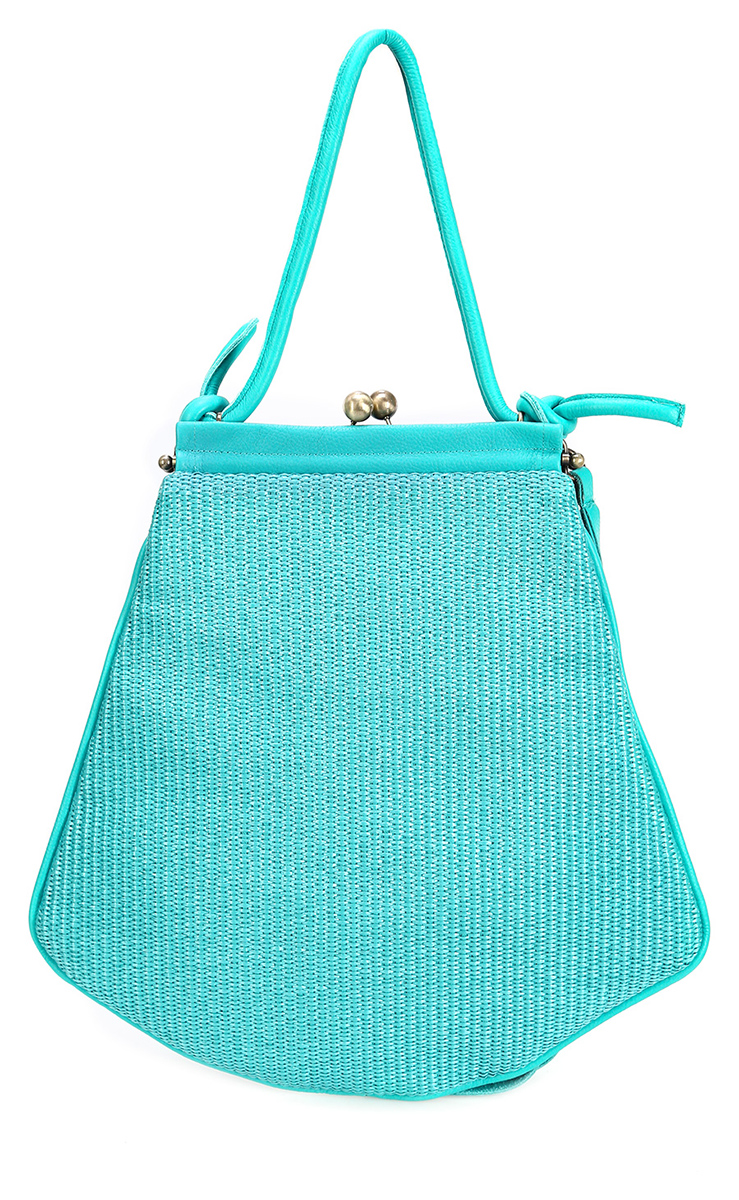 Borsa in rafia intrecciata con profili in pelle e chiusura ad incastro. Misure 44 x 42 cm. Dettagli gold. Fatta a mano in Italia.
