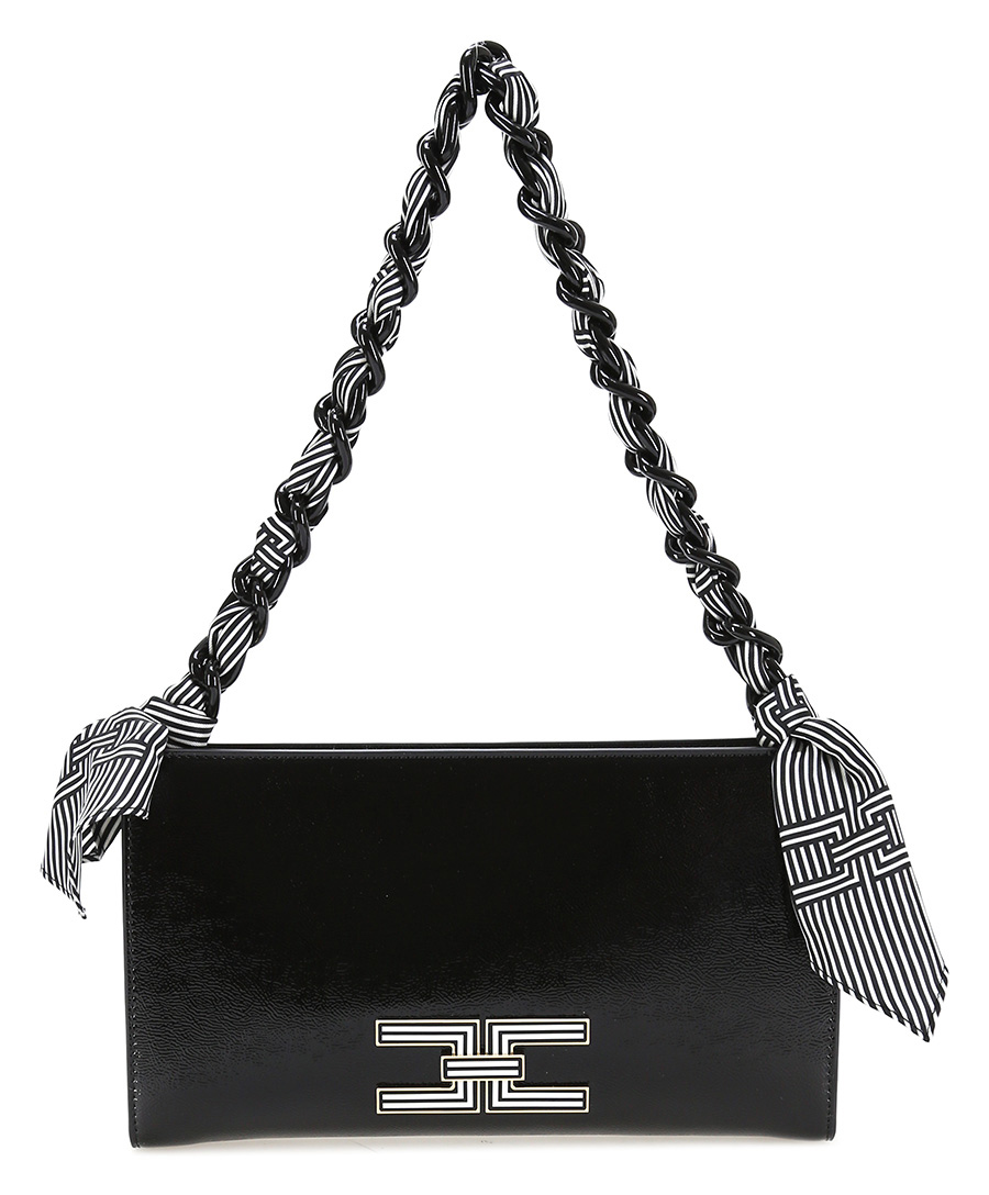Borsa in eco pelle effetto martellato con chiusura zip. Manico con foulard intrecciato. Logo frontale. Misure 28 x 16 cm. Dettagli gold.