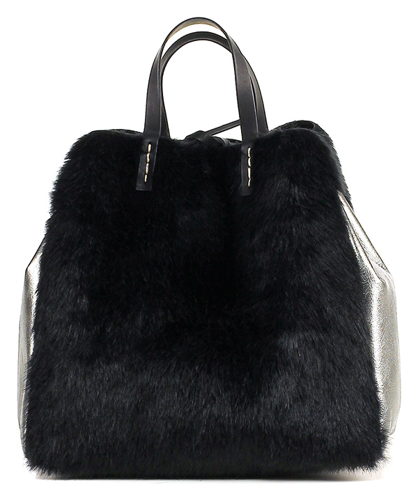 Borsa eco pelliccia e pelle laminata effetto martellato con chiusura a laccio in pelle e gancio. Sacca interna in tessuto tecnico estraibile. Misure 32 x 33 cm.