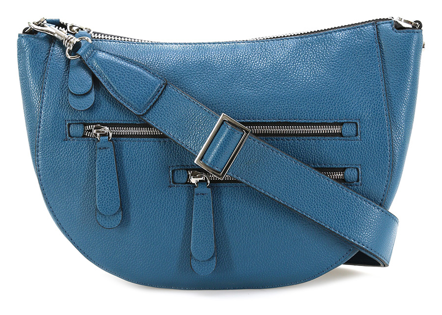Borsa in pelle effetto martellato con zip di chiusura. Tasche frontali e tracolla inclusa. Misure 29 x 23 cm. Dettagli silver.