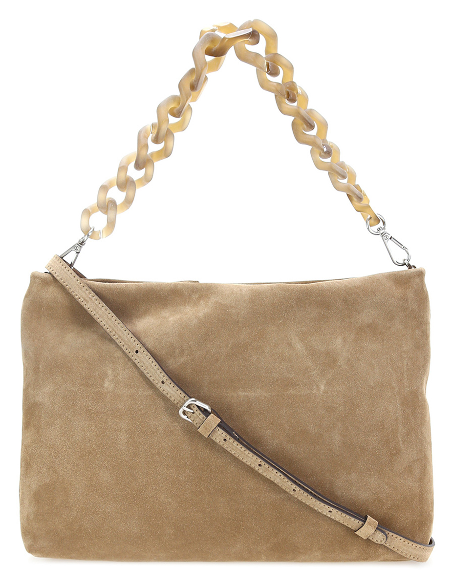 Borsa in pelle scamosciata con chiusura zip. Doppia tracolla inclusa. Misure 35 x 24 cm. Dettagli silver.