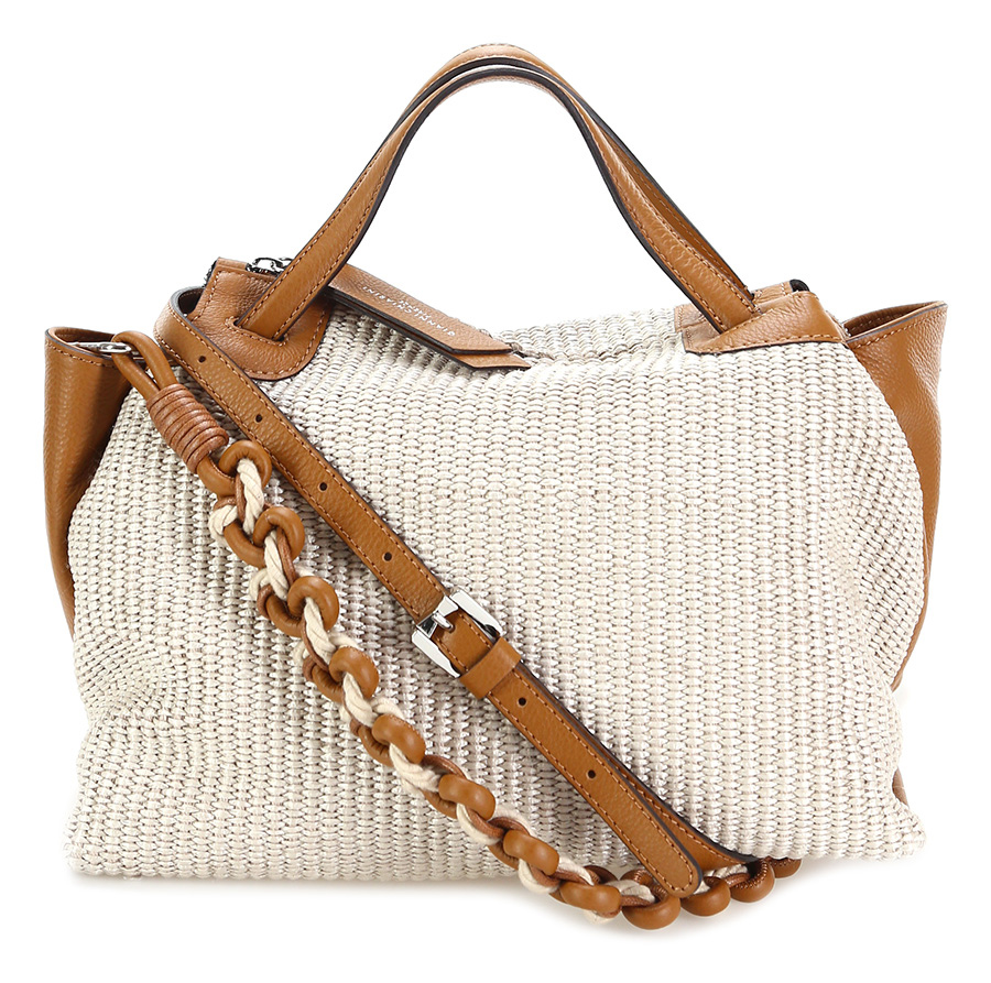 Borsa in pelle e tessuto intrecciato con chiusura zip. Tracolla inclusa. Misure 32 x 21 cm. Dettagli silver.