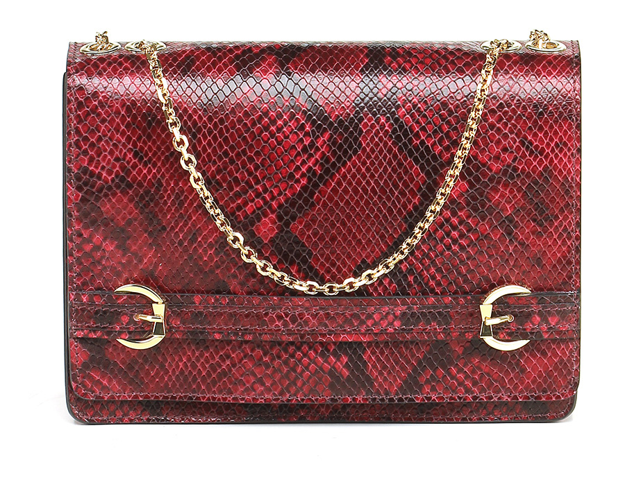 Borsa in cuoio effetto pitone con chiusura a gancio e tracolla a catena gold. Misure 20 x 17 cm.