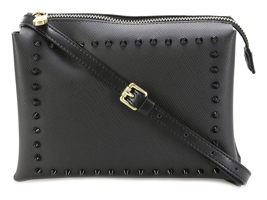 Borsa in lattice effetto martellato con chiusura zip. Borchie applicate. Tracolla inclusa. Misure 28 x 17 cm. Dettagli gold.