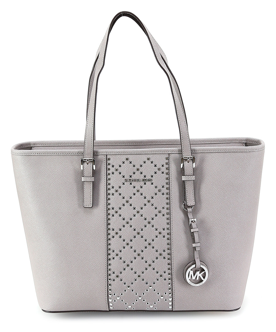 Borsa in pelle saffiano con motivo trapuntato e mini occhielli, chiusura a zip e interno con numerose tasche. Dettagli in metallo tonalità argento e pendolo con logo. Misure 33 x 26,5 cm.