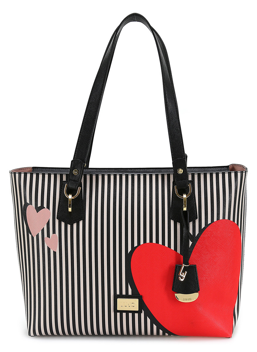 Borsa in eco pelle in fantasia rigata e decorazione frontale. Pochette porta oggetti inclusa. Misure 28 x 35 cm. Dettagli gold.