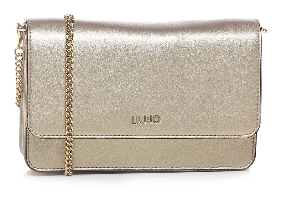 Borsa in eco pelle con bottone magnetico di chiusura. Tracolla in metallo inclusa. Misure 22 x 15 cm. Dettagli gold.
