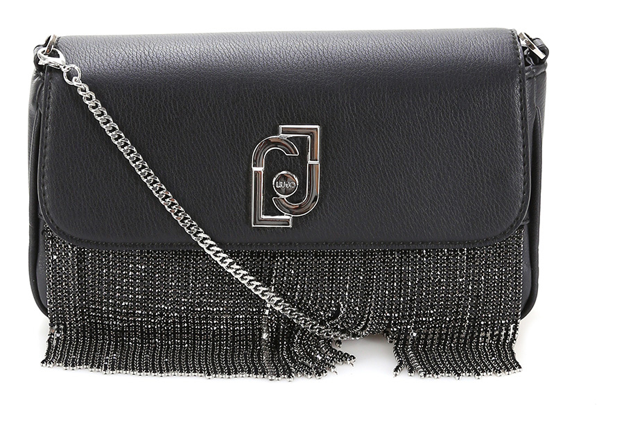 Borsa in eco pelle con bottone magnetico di chiusura. Tracolla in metallo inclusa. Frange di strass applicate. Misure 24 x 13 cm. Dettagli silver.