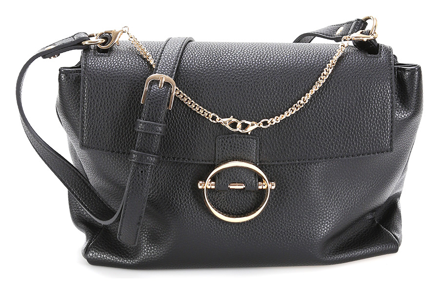 Borsa in pelle sintetica effetto martellato con bottone magnetico di chiusura. Tracolla inclusa. Pochette estraibile con tracolla inclusa. Misure 28 x 18 cm. Dettagli gold.