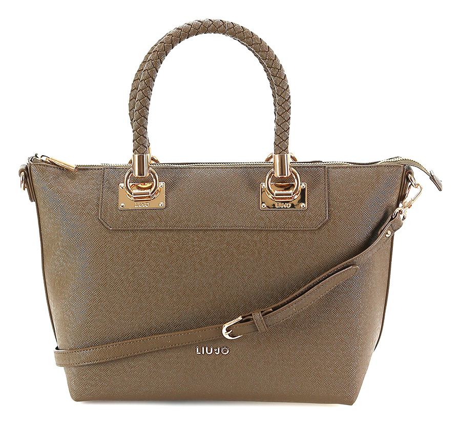 Borsa in eco pelle effetto saffiano con chiusura a zip. Manici ad intreccio, decorazioni gold e tracolla inclusa. Misure 30 x 27 cm.