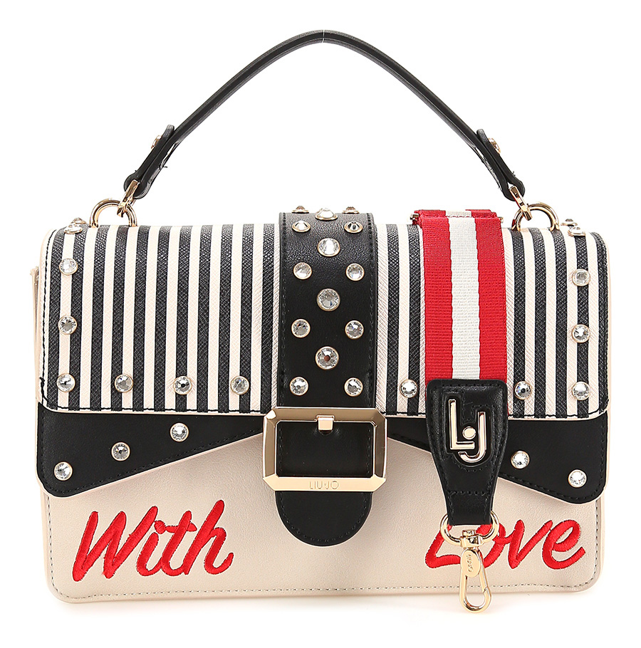 Borsa in eco pelle con fantasia a righe frontale e scritte, chiusura ad incastro. Tracolla inclusa. Misure 22 x 27 cm. Dettagli gold.
