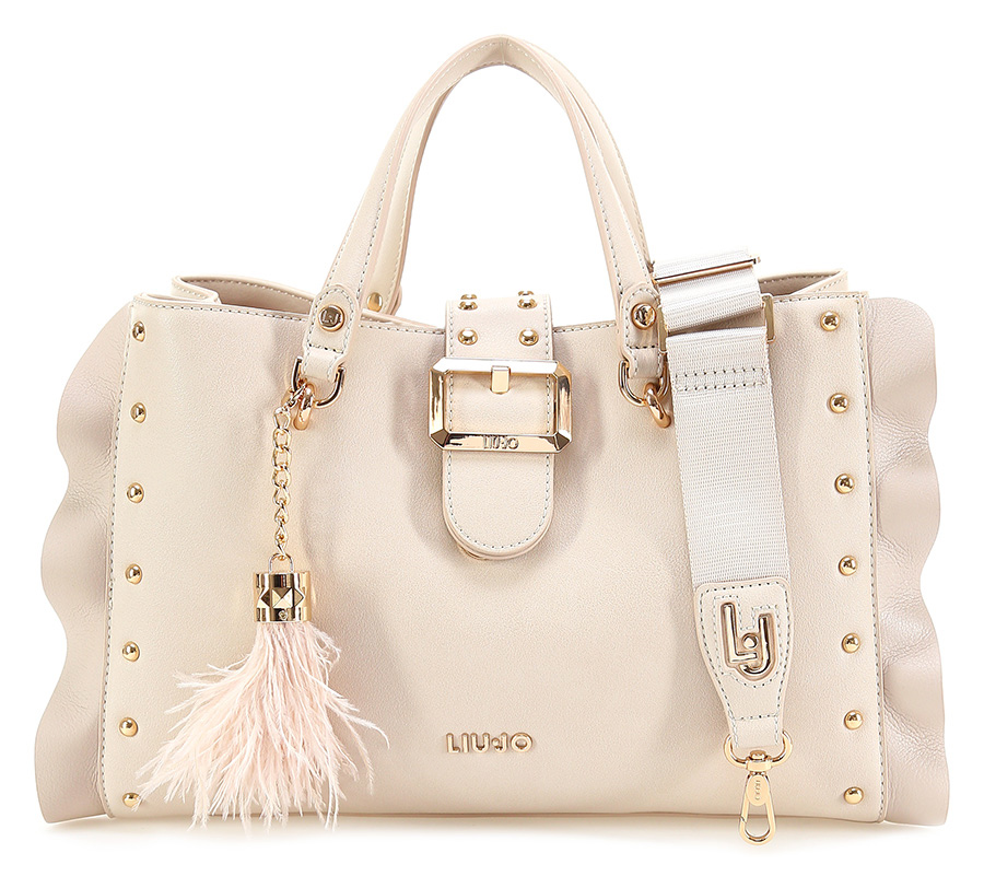 Borsa in eco pelle con fronzoli, profili borchiati e cinghia di chiusura. Tracolla inclusa. Misure 26 x 34 cm. Dettagli gold.