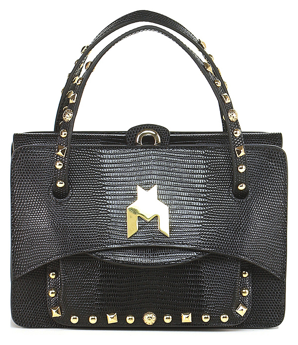 Borsa in pelle stampa tejus con chiusura a bottone magnetico e borchie. Logo in ottone frontale, pochette mobile e tracolla inclusa. Misure 22 x 17 cm.