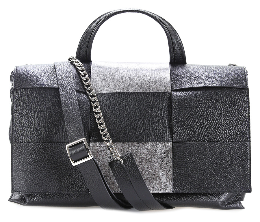 Borsa in pelle martellata con zip di chiusura. Doppia tracolla inclusa. Misure 40 x 25 cm. Dettagli silver.