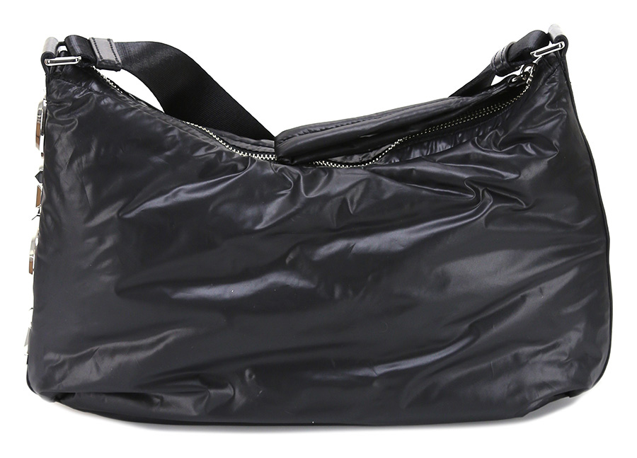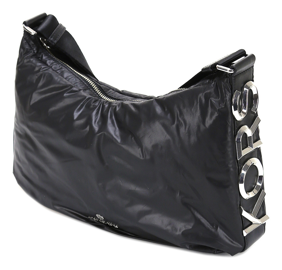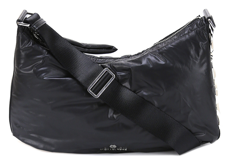 Borsa in nylon riciclato con chiusura zip. Tracolla inclusa. Misure 36 x 24 cm.