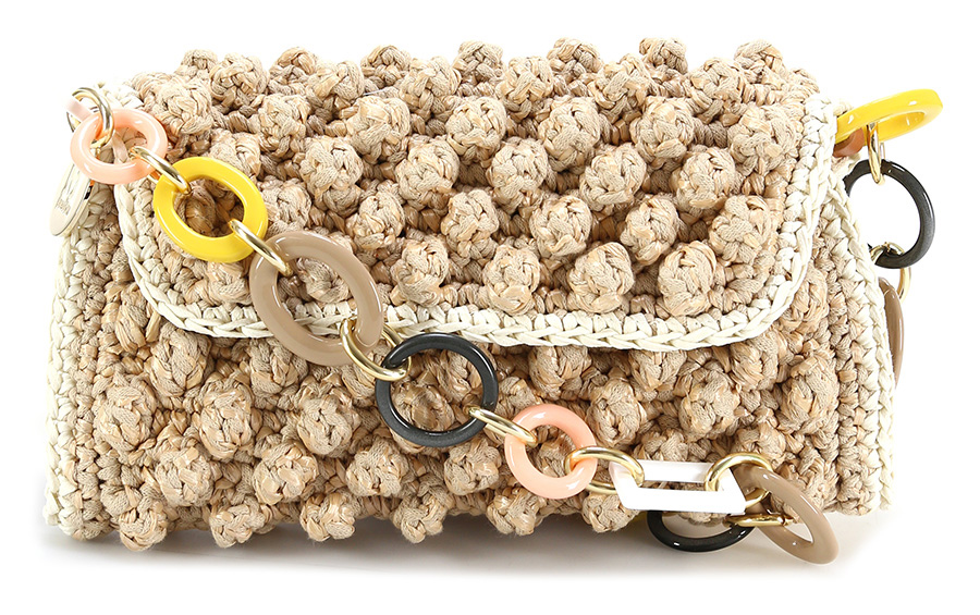 Borsa in tessuto lavorato con bottone magnetico di chiusura. Tracolla inclusa. Misure 30 x 16 cm. Dettagli gold.