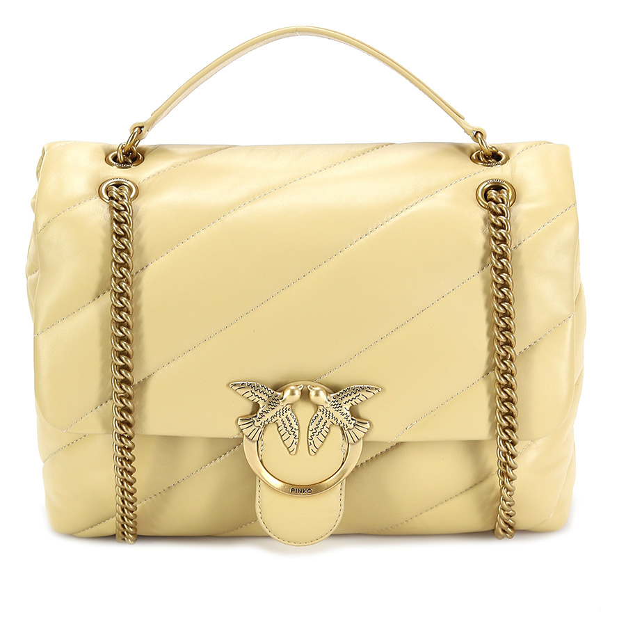 Borsa in pelle con chiusura ad incastro. Tracolla in metallo inclusa. Misure 32 x 26 cm. Dettagli gold.