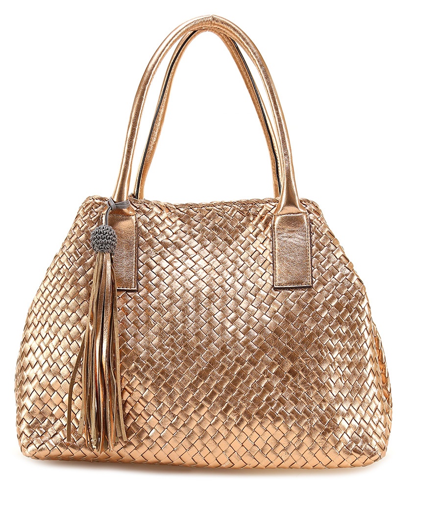 Borsa in pelle intrecciata con chiusura a bottone magnetico. Charms di pelle e tessuto con logo frontale. Pochette interna inclusa. Misure 31 x 40 cm. Dettagli silver
