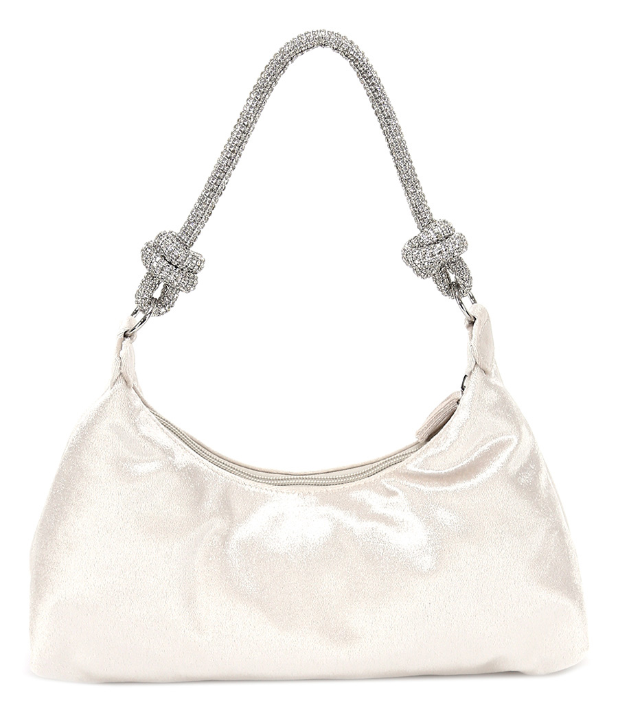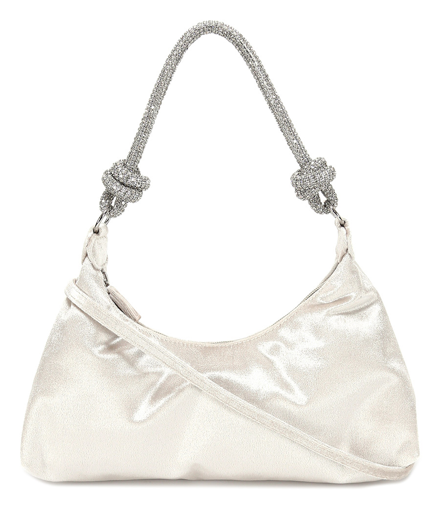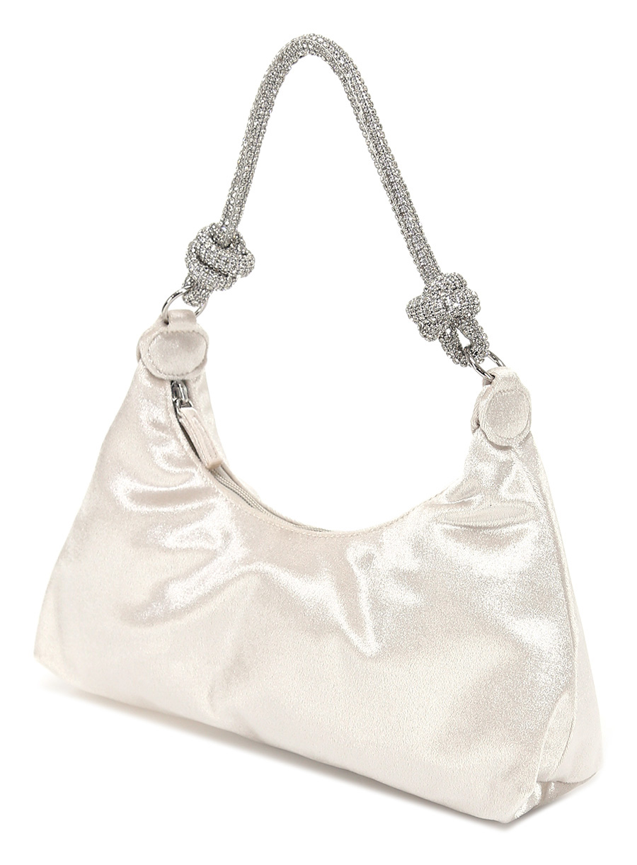 Borsa in raso con zip di chiusura. Manico con strass applicati. Tracolla inclusa. Misure 31 x 20 cm.