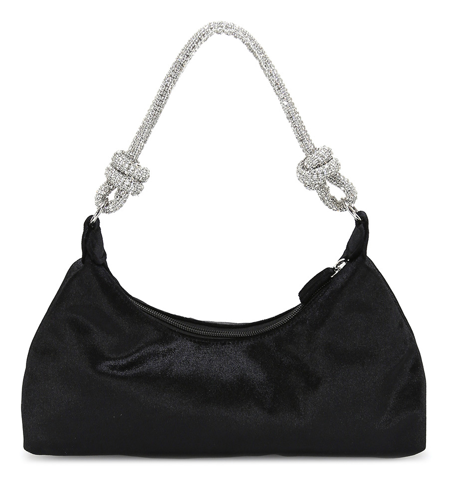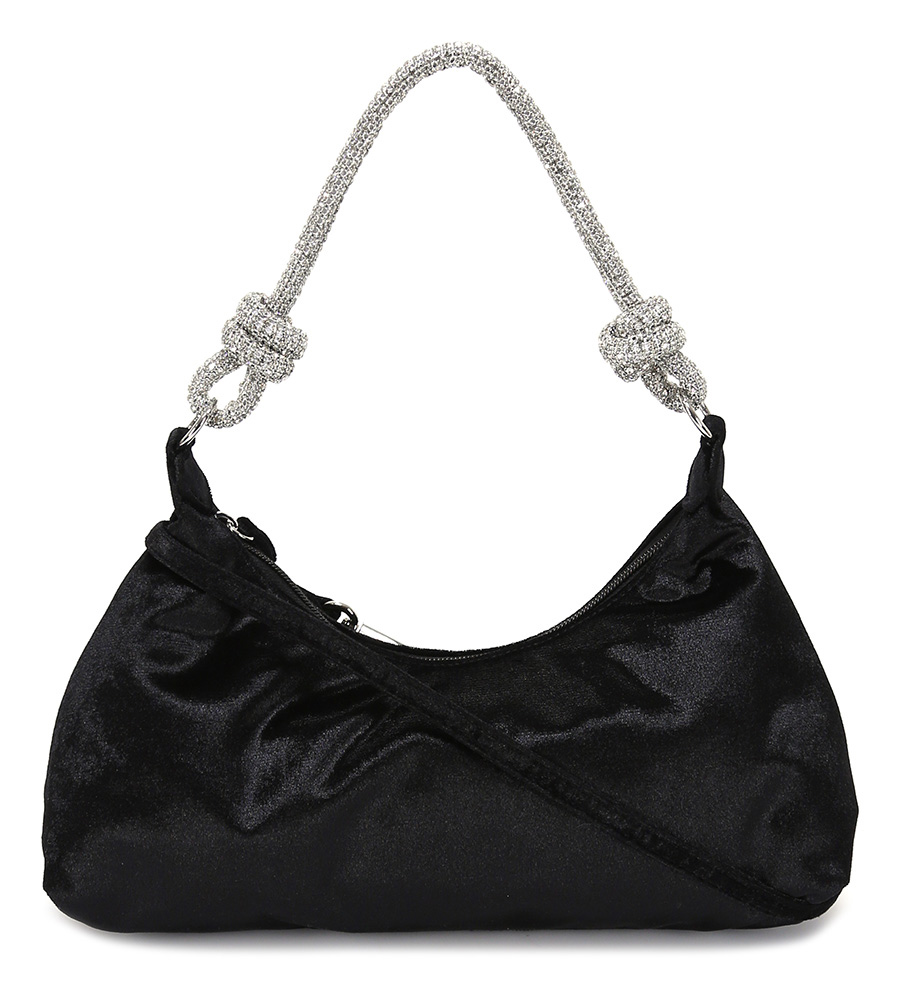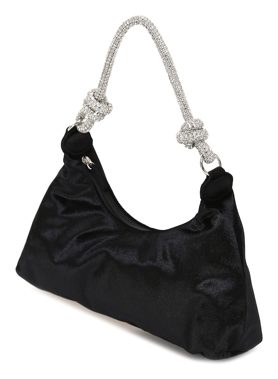 Borsa in raso con zip di chiusura. Manico con strass applicati. Tracolla inclusa. Misure 31 x 20 cm.
