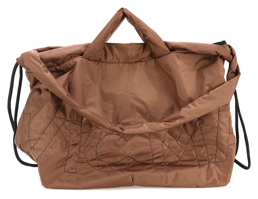 Borsa in nylon trapuntato con bottoni di chiusura. Misure 55 x 37 cm. Dettagli silver.