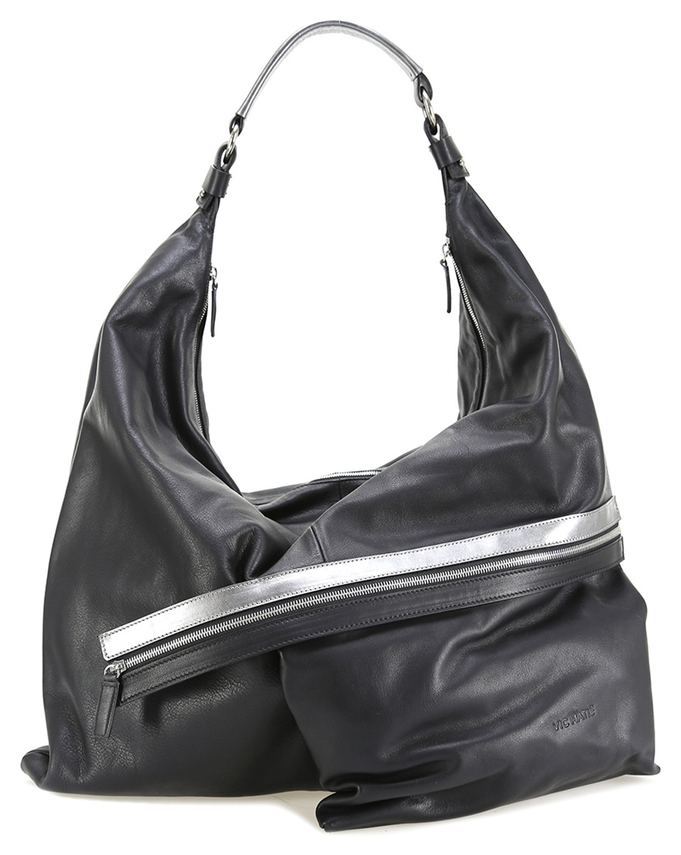 Borsa asimmetrica in pelle con chiusura a doppia zip. Misure 50 x 45 cm. Dettagli silver.
