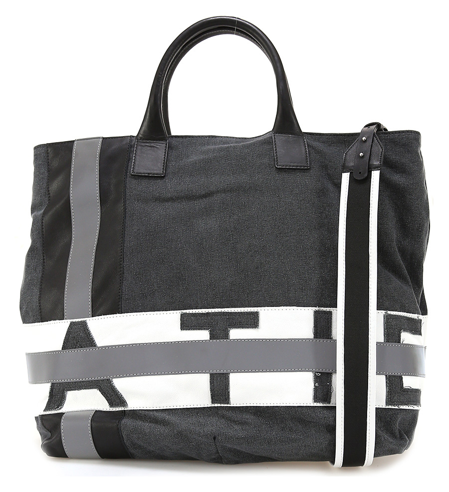 Borsa in tessuto con stampe in pelle con chiusura a zip. Tracolla inclusa in tessuto e pelle. Misure 40 x 44 cm. Dettagli silver.
