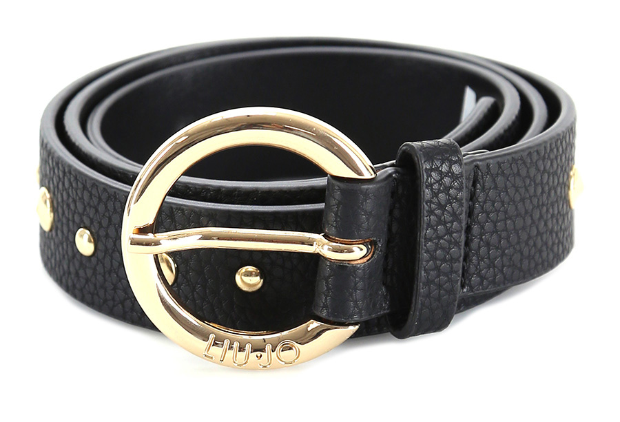 Cintura in pelle con fibbia in metallo e borchie applicate. Altezza 3 cm. Dettagli gold.