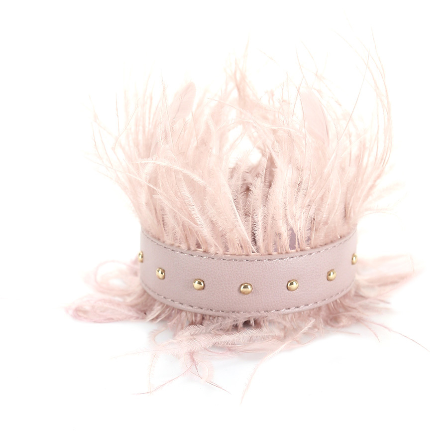 Cintura in eco pelle effetto martellato con bottoni di chiusura e piume applicate. Altezza cinturino 2,5 cm, altezza piume 18 cm. Dettagli gold.