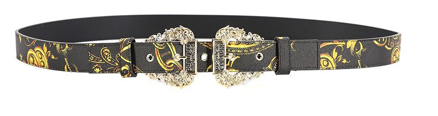 Cintura in pelle sintetica con doppia fibbia in metallo. Fantasia barocca. Altezza 3 cm. Dettagli gold.