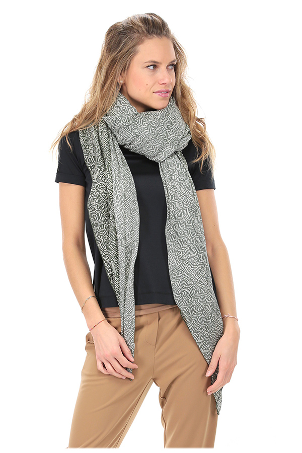 Foulard in cotone e seta con taglio asimmetrico e stampa a fantasia. La modella è alta 1.68.
