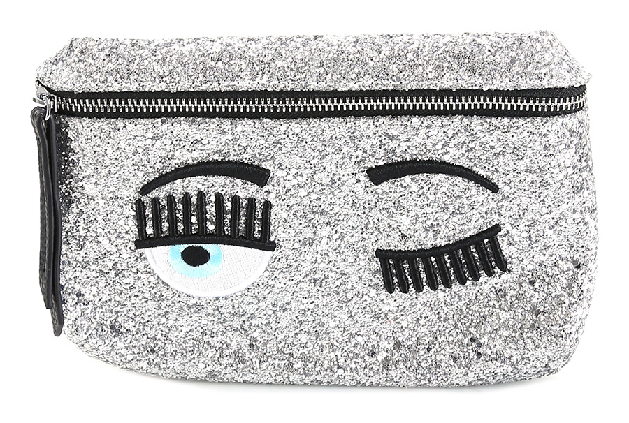 Marsupio glitter con chiusura zip. Logo frontale. Cinturino incluso. Misure 27 x 17 cm. Dettagli silver.