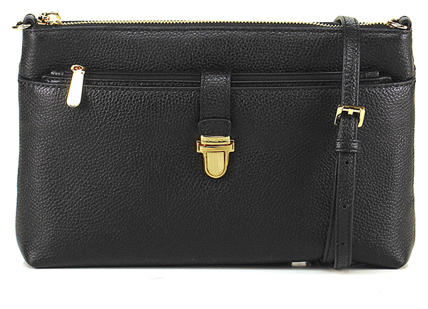 Pochette in pelle martellata con chiusura a zip e tasca a zip frontale con gancio. Tracolla inclusa, decorazioni gold, misure 26 x 17 cm. Busta interna inclusa.