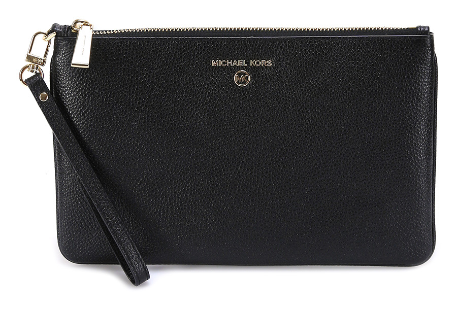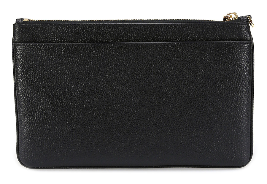 Pochette in pelle martellata con zip di chiusura. Polsino incluso. Misure 26 x 17 cm.