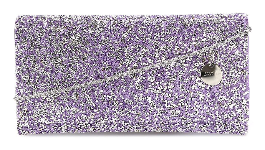 Pochette con chiusura magnetica. Perline applicate. Tracolla intrecciata in metallo inclusa. Misure 24 x 14 cm. Dettagli silver.