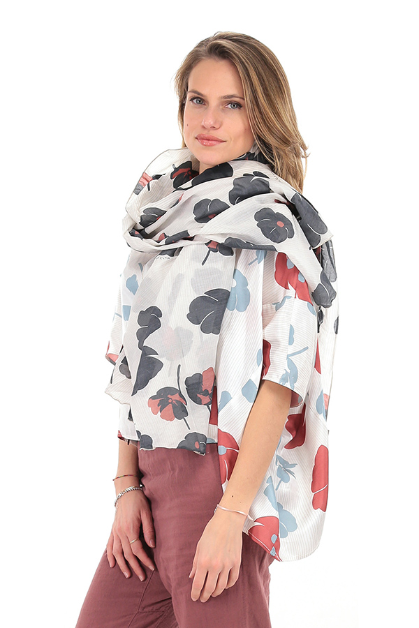Foulard in cotone e seta con taglio asimmetrico. Stampa a pois. La modella è alta 1.68.