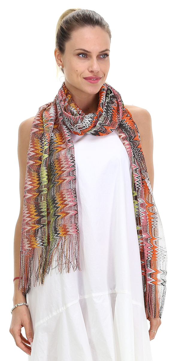 Stola in misto viscosa con fantasia a zig zag. Frange sul fondo.