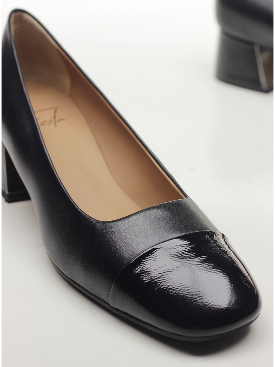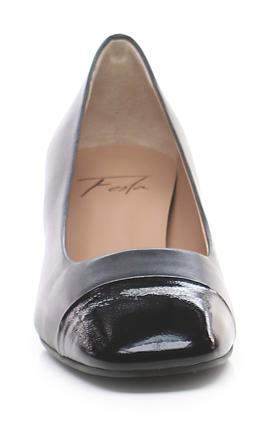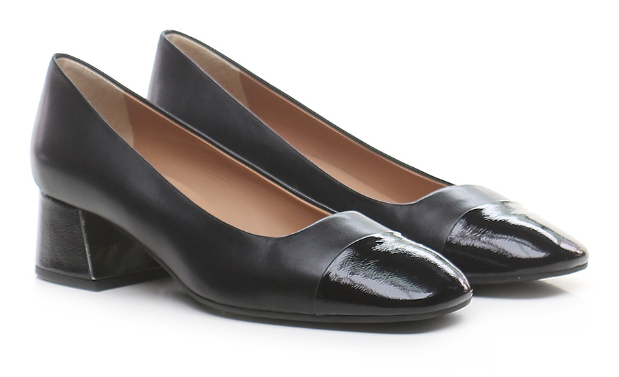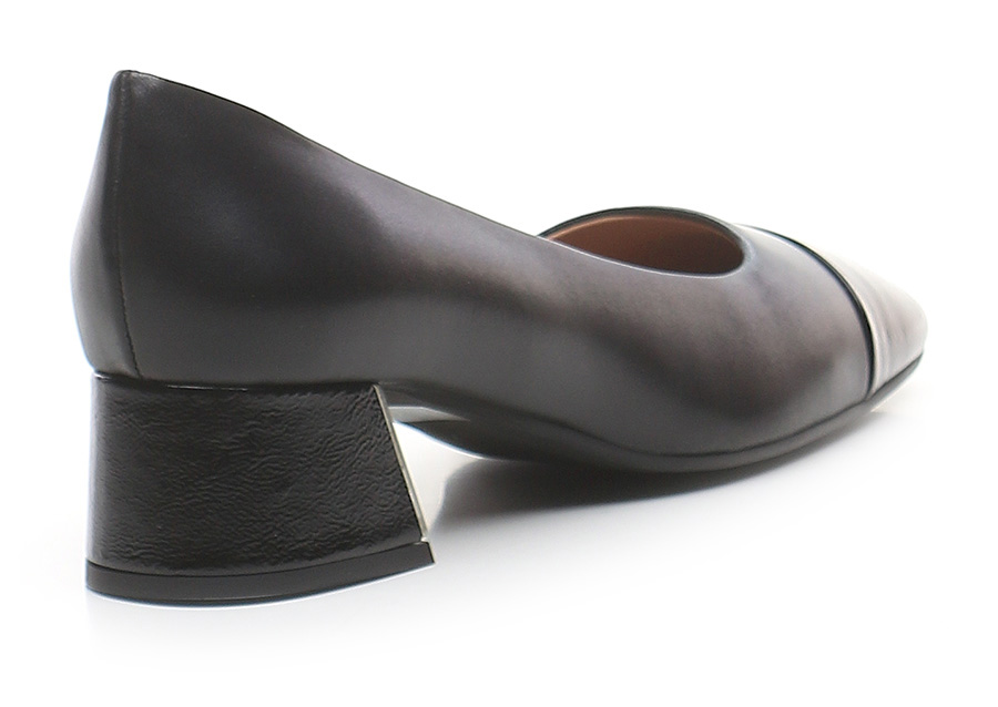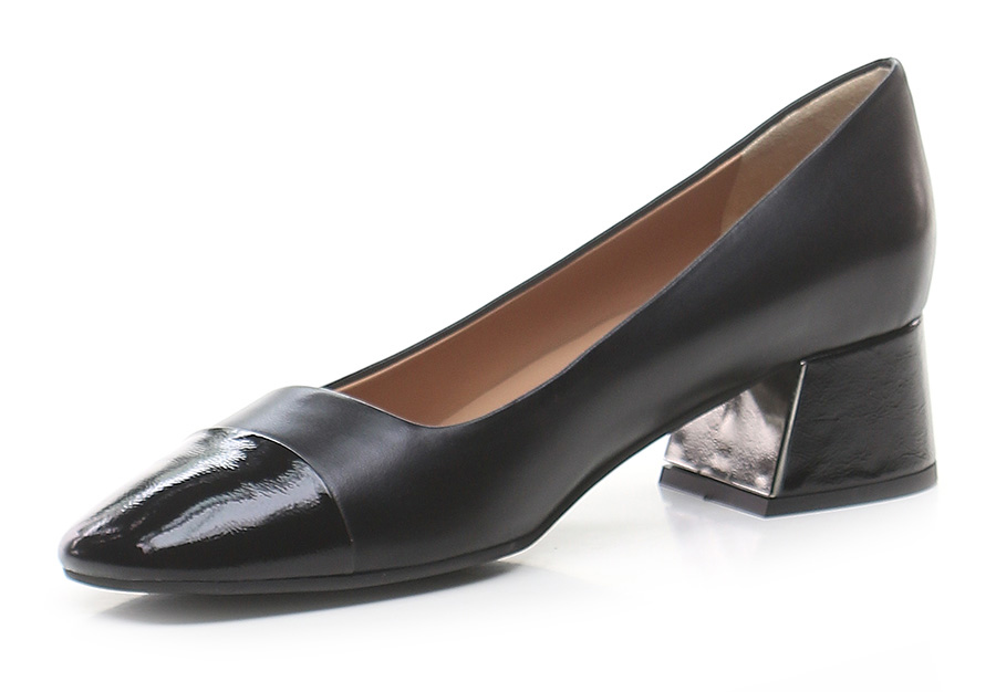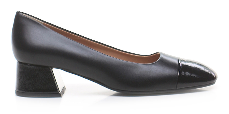 Scarpa in pelle e naplak con suola in gomma. Altezza tacco 45mm.