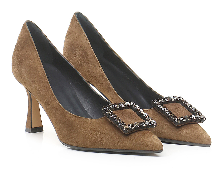 Scarpa in camoscio con accessorio frontale con pietre. Suola in cuoio e gomma. Altezza tacco 75mm.