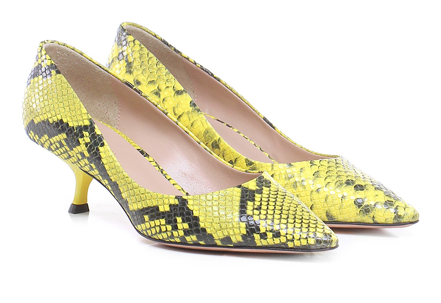 Decolletè in pelle effetto pitone, suola in cuoio. Tacco 50.