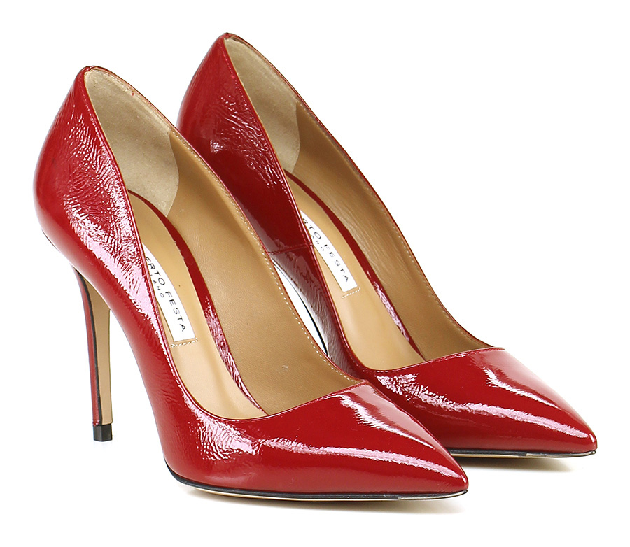 Decolletè in vernice vintage con suola in cuoio. Tacco 100.