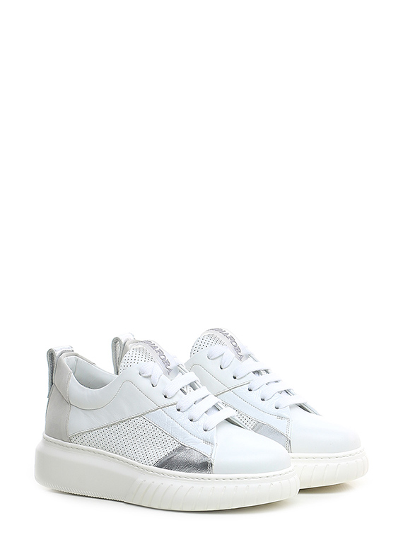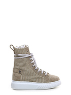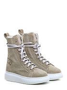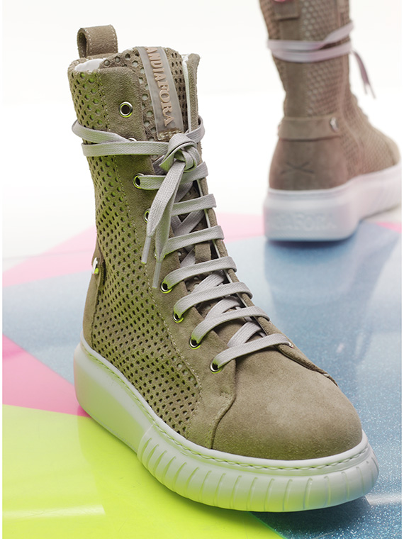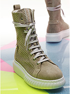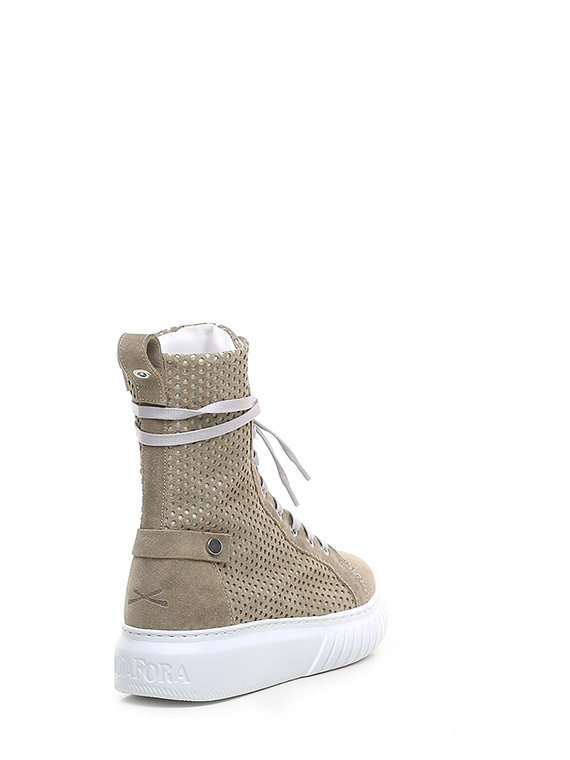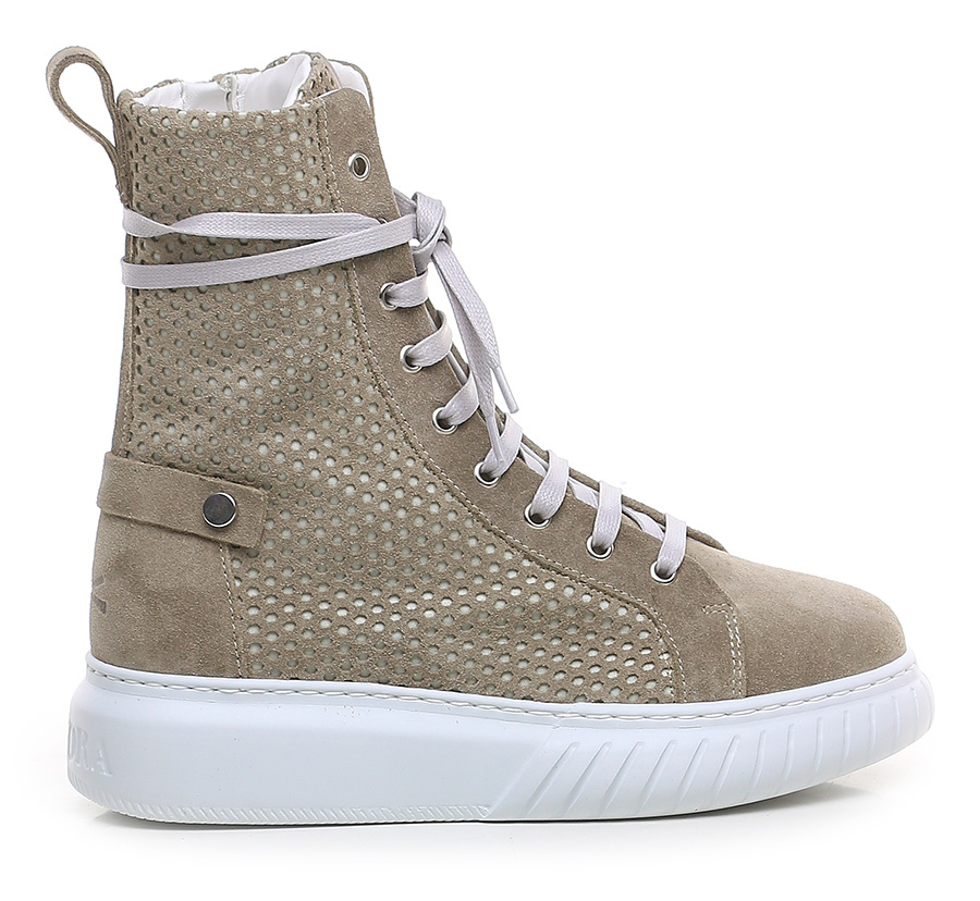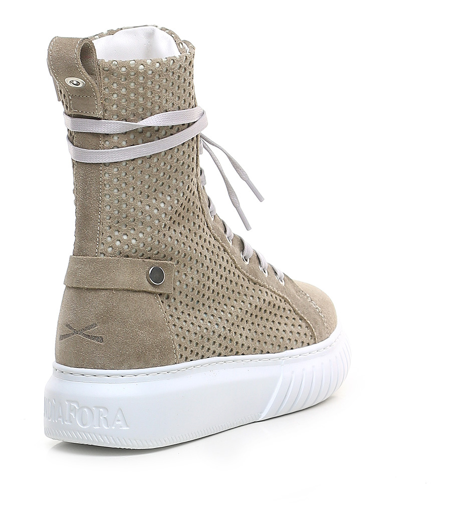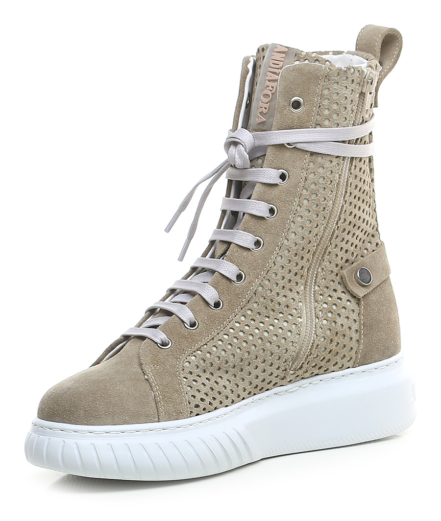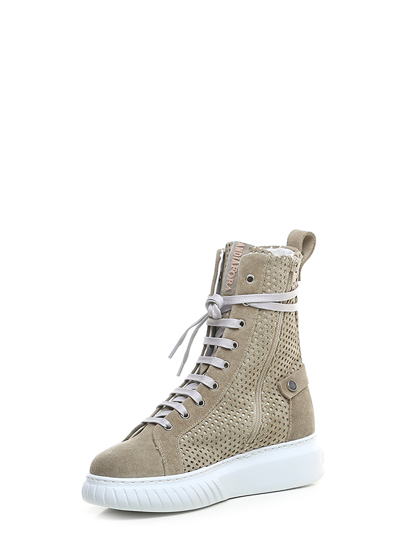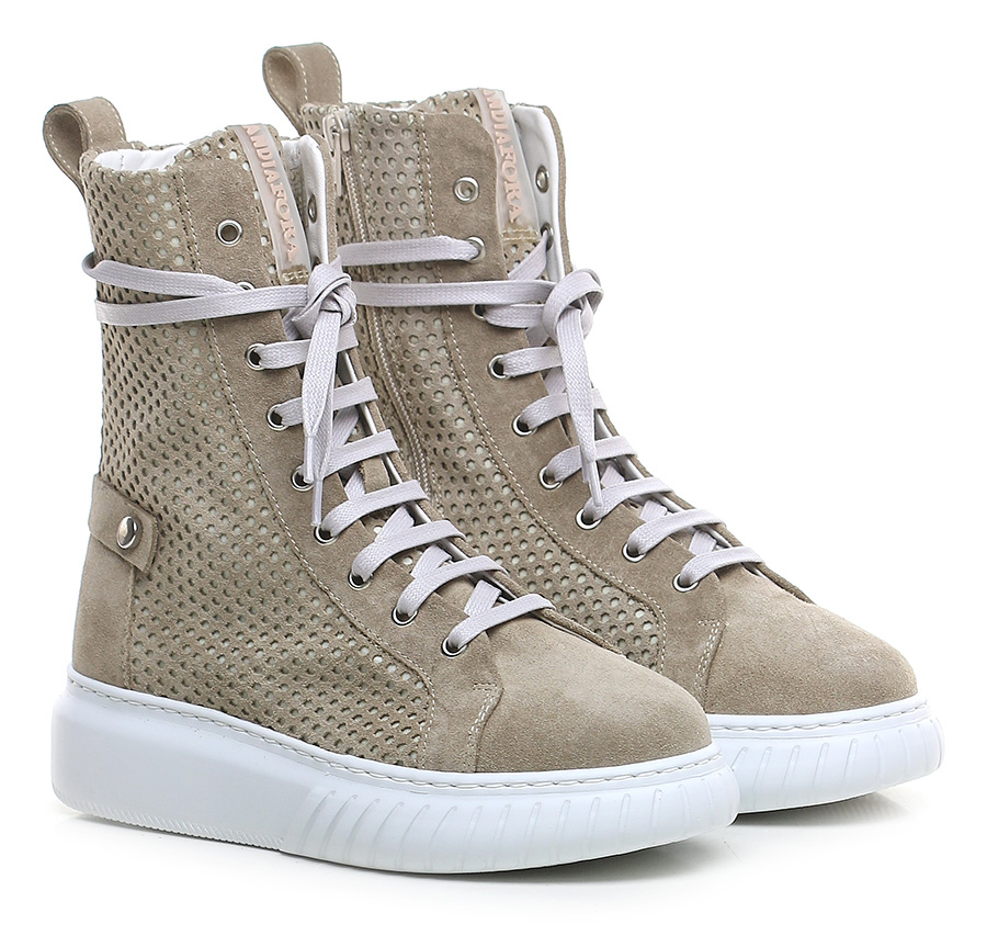 Polacco in camoscio e camoscio traforato con zip laterale e suola in gomma. Altezza tacco 40mm, platform 30mm con battuta 10mm.