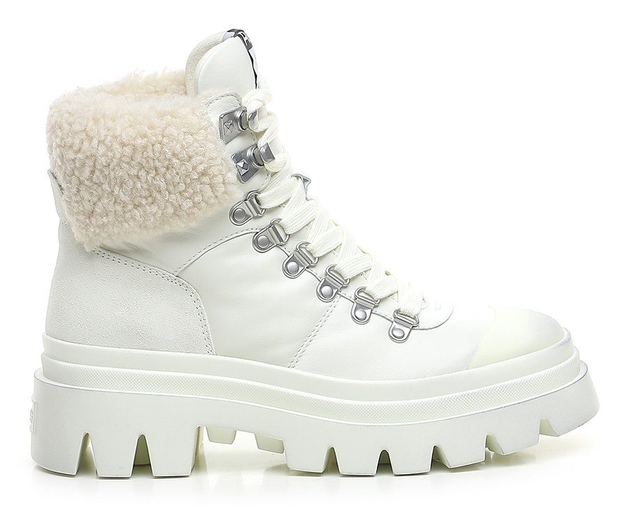 Polacco in pelle con talloncino in camoscio con inserti in fake fur. Suola in gomma. Altezza tacco 60mm, platform 45mm con battuta 15mm.