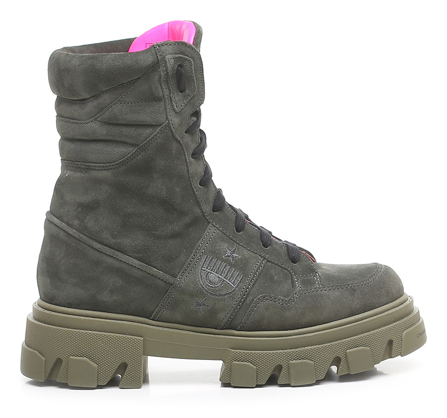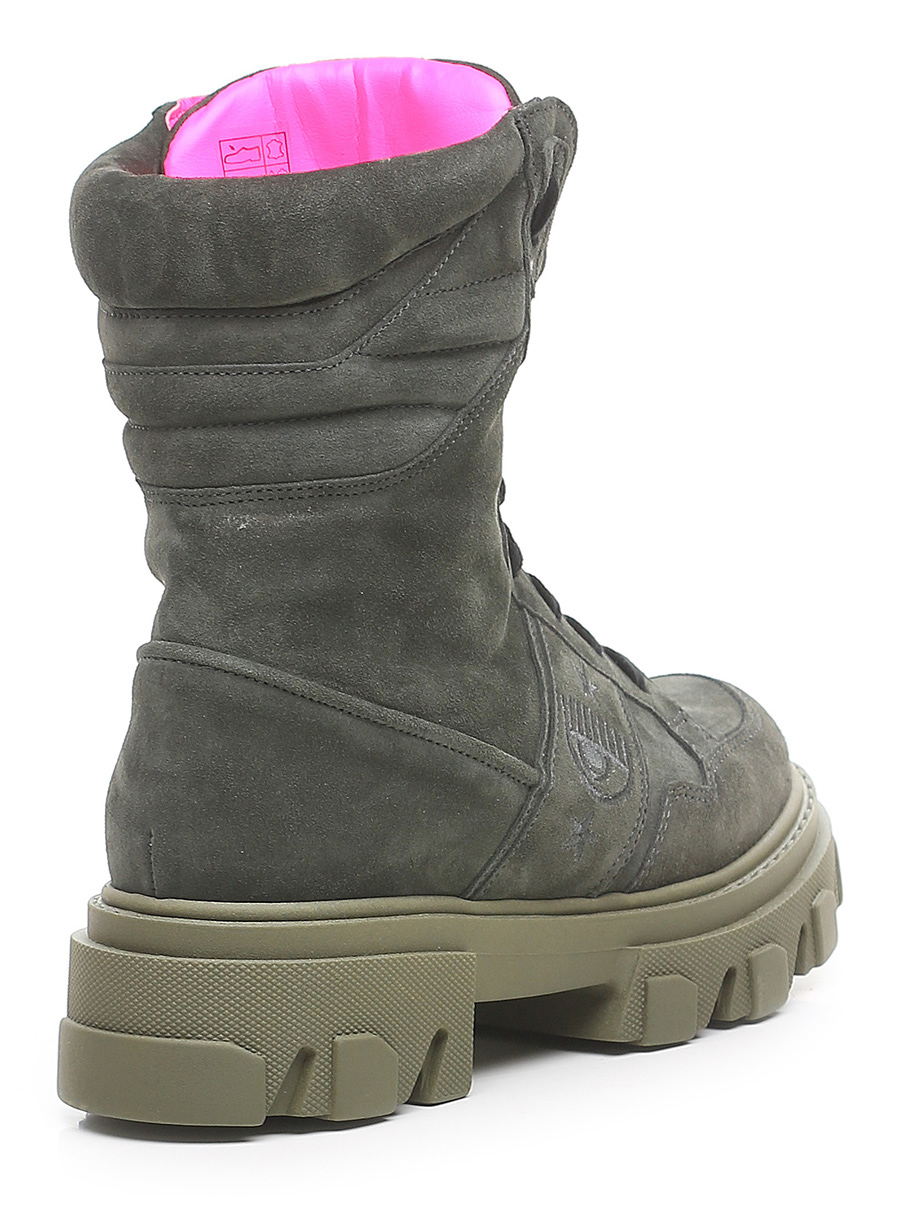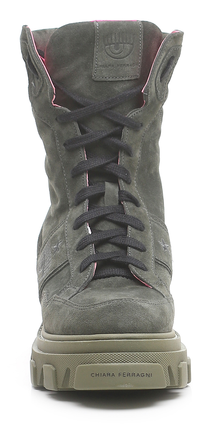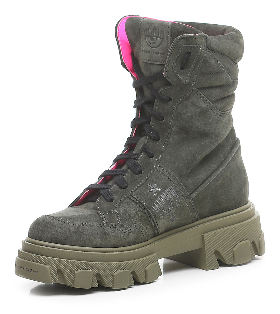Polacco in camoscio con suola in gomma. Altezza tacco 50mm, platform 30mm con battuta 20mm.