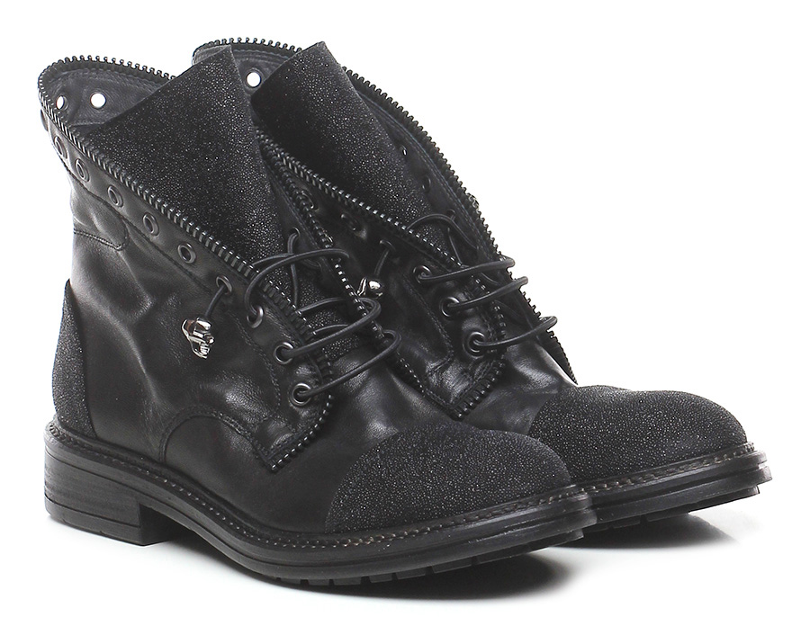 Polacco in pelle con linguetta e puntale in pelle effetto razza, suola in gomma. Tacco 40, platform 15 con battuta 25. Profilo tomaia effetto zip con lacci elasticizzati a coulisse con applicazione .
