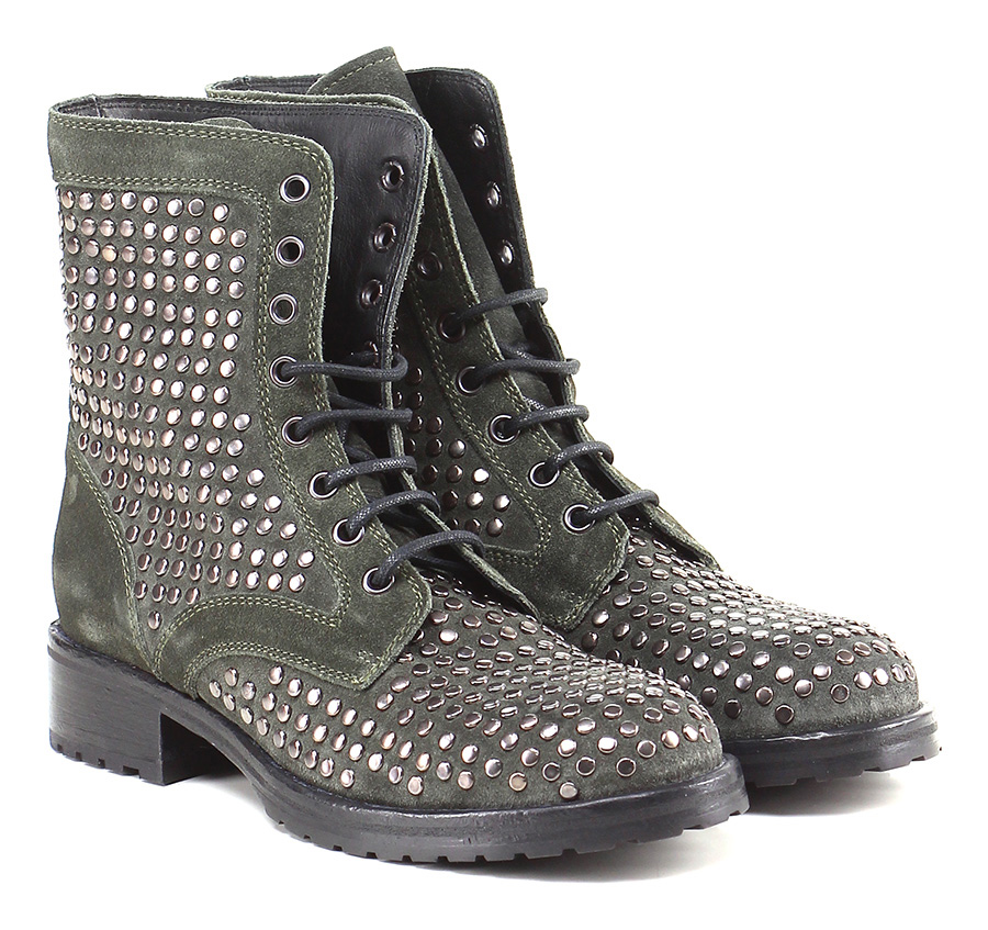 Polacco in crosta con borchie su tomaia e suola in cuoio. Tacco 35, platform 15 con battuta 20.