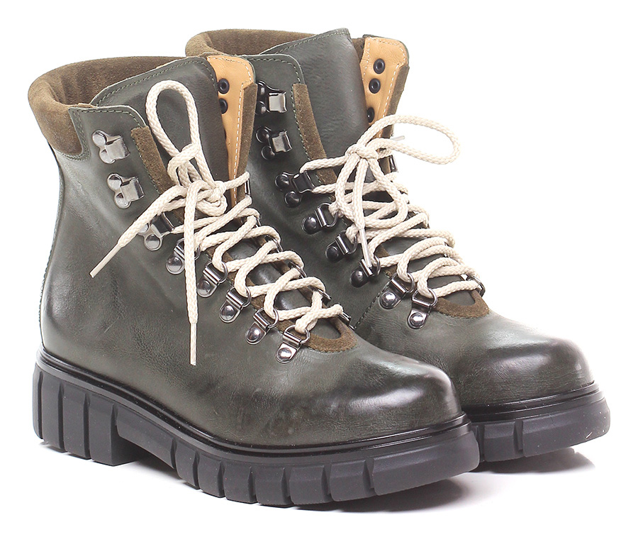 Polacco in pelle effetto delavè vintage con inserto in camoscio su retro. Suola in gomma, tacco 45, platform 25 con battuta 20.
